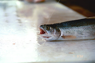 Ian (then 14 y/o) and I landed in Anchorage using many of the frequent flier miles I had acquired during numerous business trips to Japan. We rented an old Ford Taurus from a 'mom & pop' operation and drove down to Cooper Landing near Kenai Lake. Initially, we camped. Then I found some old cabins, one of which I could rent for $35 a night! The owner's wife was furious with him that he let it go for such an incredibly low price at that time of year. Ian befriended his son, who'd recently been 'med evacuated' by helicopter to Anchorage after falling out of a tree and having his stomach sliced open to an extent that his entrails were flowing out. His father had to hold them in on the trip to the hospital because the local nurse was nauseous at the sight. The doctors stuffed them back in, stapled him up, and sent him home to continue the life of a boy in the Alaskan wild. His bright red, newly formed scar appeared like an external capillary and he wore it too proudly much to the consternation of his parents. One in four boys, he could (and often did) avoid their oversight.